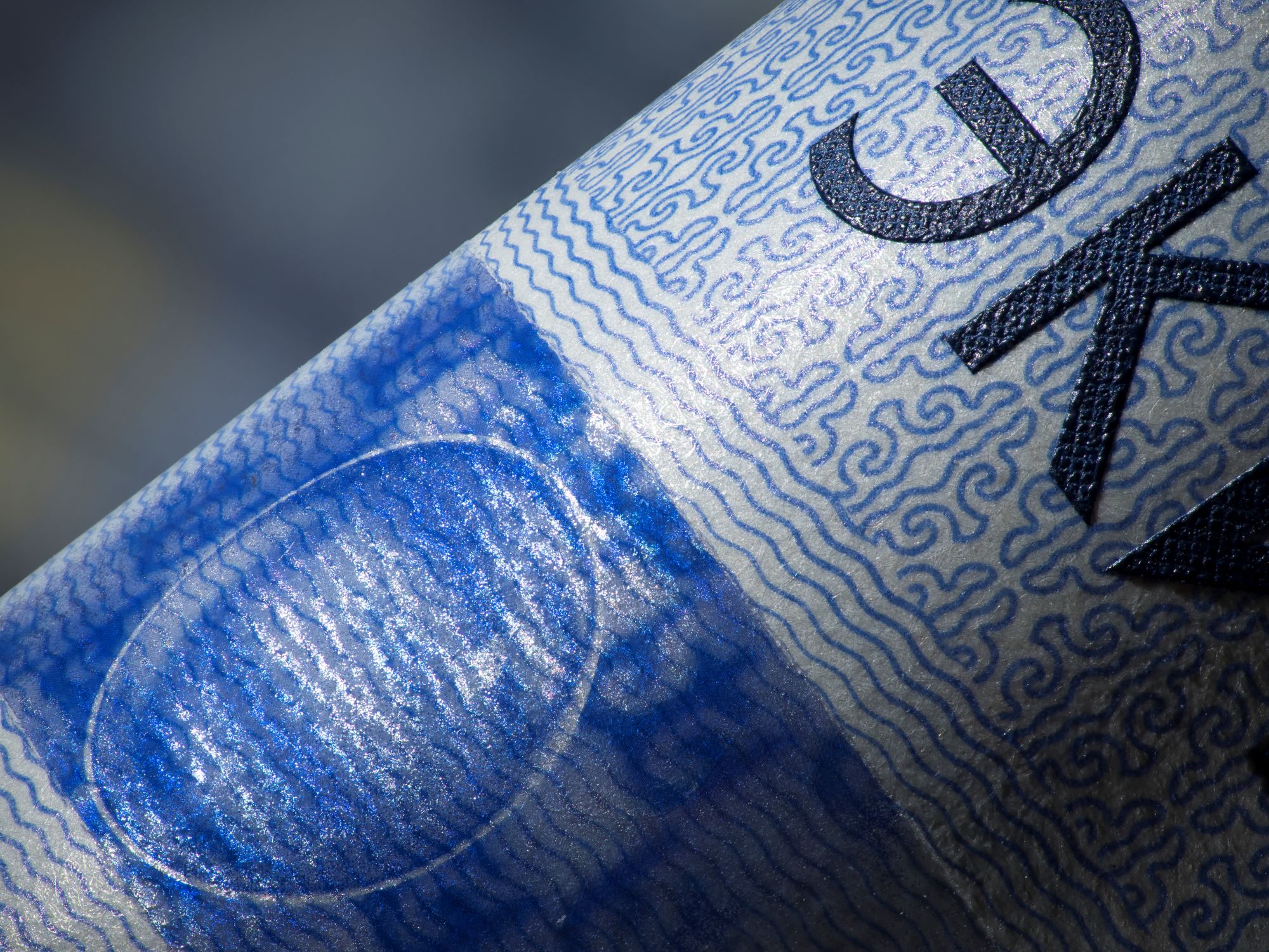 - Topo (topographic) effect on the 2000 Som banknote shows a “water droplet” that seems to rest on the surface of the banknote – the patterns beneath it change size and acceleration when tilted