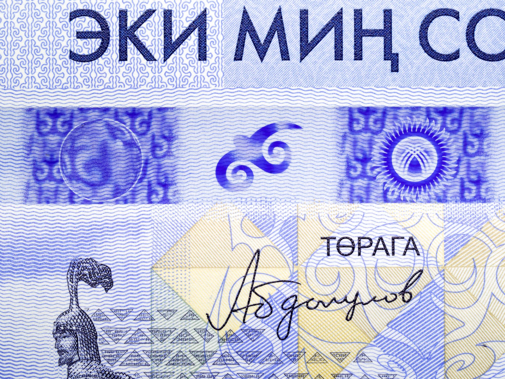 The banknote depicts growth of the Kyrgyz nation from ancient times to the present day. The main plot of the design is the monument of the national hero “Manas” who united the Kyrgyz tribes and the quote from the epos of “Manas” that says: