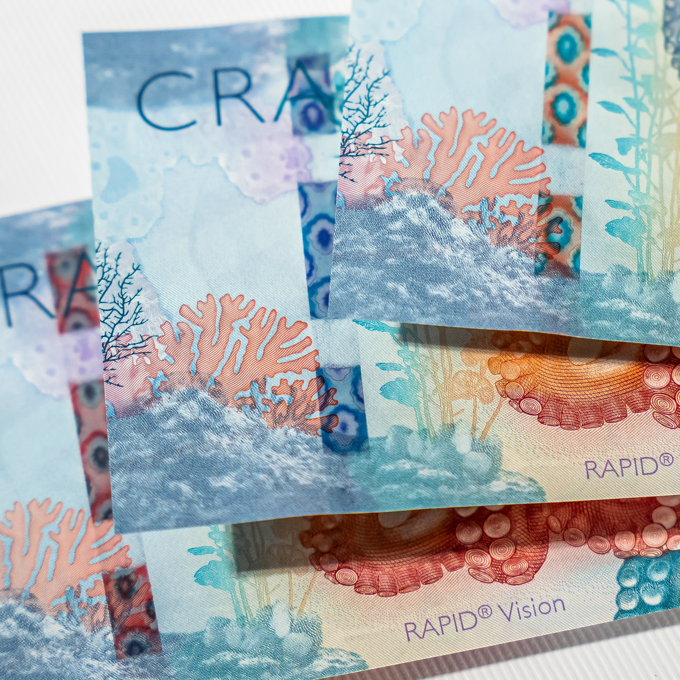 To showcase the new feature and customization process of RAPID® Vision, Crane Currency has produced the “Intelligent Evolution” house note. With a giant Pacific octopus as its portrait, the note speaks to purposive beauty and adaptation.